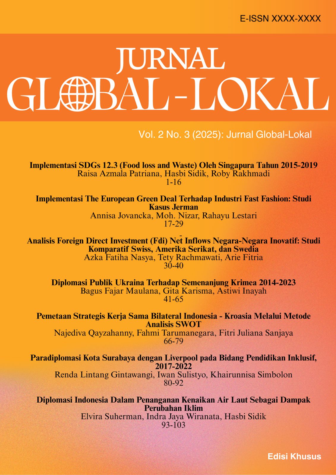 Menindaklanjuti isu FLW global, tahun 2015 UN menggagas rencana jangka panjang yang konkret dalam perwujudan Agenda Sustainable Development Goals (SDGs) 2030 poin 12.3 mengenai FLW yang berbunyi pengurangan separuh limbah pangan global per kapita pada tingkat ritel dan konsumen tahun 2030 serta mengurangi terjadinya kehilangan pangan pada rantai produksi, pasokan dan pasca panen tahun 2030. Peluncuran SDGs tahun 2015 telah menjadi pedoman peningkatan kesejahteraan yang diadopsi oleh sejumlah negara di dunia, salah satunya adalah Singapura. Konsep dan teori yang digunakan dalam penelitian ini adalah konsep Sustainable Development Goals (SDGs) dan teori Rezim Internasional melalui lima tahapan. Penelitian ini menggunakan pendeatan kualitatif yang bersifat deskriptif dengan menggunakan metode pengumpulan data melalui studi literatur dan studi dokumentasi. Jenis data yang digunakan dalam penelitian ini menggunakan data sekunder yang berasal dari jurnal ilmiah, buku-buku, laporan resmi, dan artikel-artikel resmi yang dipublikasi oleh pemerintah. Hasil dari penelitian ini menunjukkan bahwa upaya Singapura dalam menangani isu FLW melalui 5 tahapan pengimplementasian SDGs yaitu tahap pertama adalah Singapura berkomitmen pada agenda SDGs sejak diluncurkan tahun 2015, tahap kedua adalah peluncuran Zero Waste Nation, tahap ketiga adalah upaya penanganan FLW melalui prinsip 3 R (reduce, reuse dan recycle), tahap keempat adalah hasil dimana Singapura terus mencapai kemajuan dalam Agenda 2030 dan tahap kelima adalah evaluasi berisi tantangan dan peluang yang diperoleh Singapura.